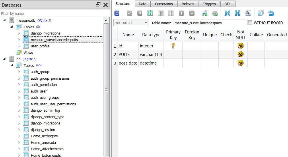 so the same issue it creates a new database named measure.db but it creates all tables in the first database+ the new table named SurveillanceDesPuits?